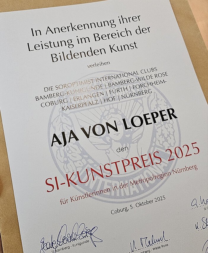 Am 5. Oktober 2025 fand die Preisverleihung an die Künstlerin Anja Loeper mit einem Festakt im Kunstverein Coburg statt. Zwei Hofer Soroptimistinnen nahmen als Vertreterinnen ihres Clubs teil. Die Festveranstaltung glänzte mit beeindruckenden Redebeiträgen und wunderbaren Tanzeinlagen.