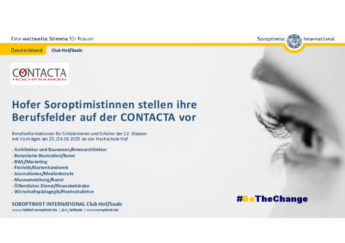 Hofer Soroptimistinnen waren 2025 erstmals als Referentinnen bei der Berufsinformationsmesse CONTACTA vertreten. In 30-minütigen Impulsvorträgen berichteten sie von ihren persönlichen Berufs- und Karrierewegen.