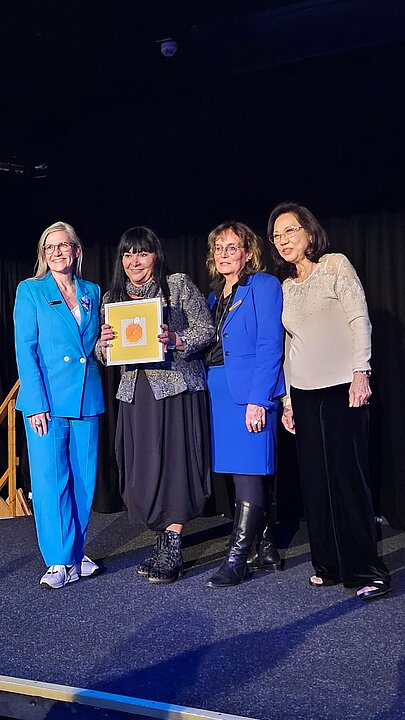 Künstlerin Katja Katholing-Blosse mit der Gewinnerin des Bildes und Clubpräsidentin von SI-Hof Annerose Zuber, daneben Weltpräsidentin von Soroptimist International