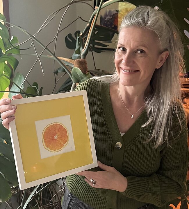Dieses fotorealistische Aquarell zeigt eine aufgeschnittene Orange und trägt den Titel “Embrace your inner ORANGE”. Das Motiv wurde extra für SI umgesetzt und steht im engen Bezug zu den Orange Days.