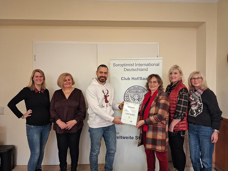 von links: Tina Schlossbauer (Fachgruppenleitung Migration und Soziale Beratung), Jenan Eischoa und Adel Fattal (GeckoPlus), Präsidentin Annerose Zuber mit Astrid Möldner und Sigrid Ludwig (alle drei SI-Club Hof)